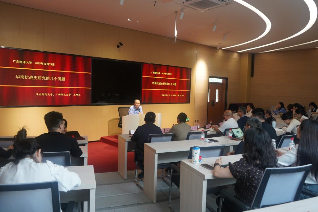 报告中,左双文教授围绕华南抗战史的核心议题,凭借清晰的逻辑、翔实的史料和深刻的洞见展开论述。他首先从历史必然性切入,深入剖析中国为什么要“奋起抵抗”的时代背景与核心动因,还原了抗战爆发前后的复杂局势;聚焦中共在南方革命的战略布局,阐释了党在华南地区的革命部署与历史根基;系统分析华南正面战场的战略价值及其独特性,展现了华南军民在抗战中的重要贡献;最后深入解读中共华南敌后抗战的历史意义,凸显了敌后战场在全民族抗战中的战略支撑作用。整场报告既有宏观的历史脉络梳理,又有微观的历史细节考证,让在场师生对华南抗战的历史地位、战略意义及精神内核有了更全面、更深刻的认识。