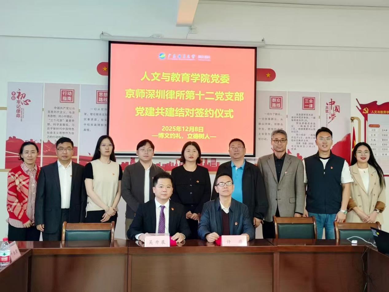 人文与教育学院始终秉持“博文约礼立德树人”院训,深耕人文教育领域,在人才培养、学科建设与社会服务中持续发力。此次结对共建,学院立足宪法宣传教育的重要契机,旨在以党建引领推动教育资源与法律资源深度融合。京师深圳律师事务所第十二党支部坚守“党建促所建、专业报社会”的发展理念,其所在律所党组织已累计与80余家单位建立共建关系,在“法治+教育”领域积累了丰富的实践经验和优质资源,具备深厚的专业服务能力与强烈的社会责任感。