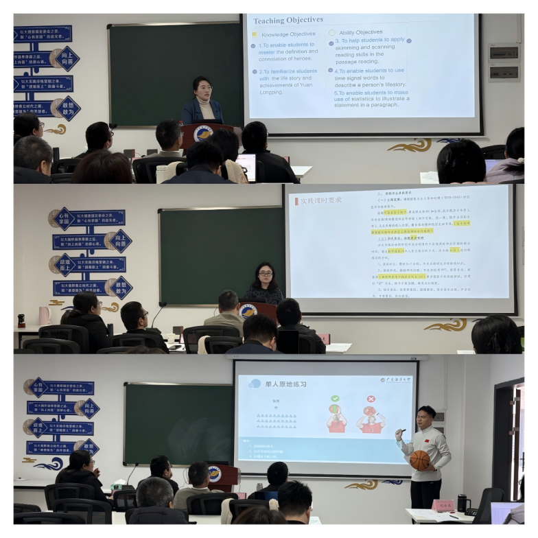 本次竞赛覆盖大学英语、思政、公共体育三大课程领域。关沛欣老师的《大学英语读写1》课程结合袁隆平生前事迹,引导学生探讨“英雄内涵”,融入价值观教育;沙广惠老师的《毛泽东思想和中国特色社会主义理论体系概论》课运用思维导图与情境代入法,帮助学生理解理论逻辑;许家声老师的《篮球》课采用“理论讲解+实操纠错”模式,让学生快速掌握技术要点。